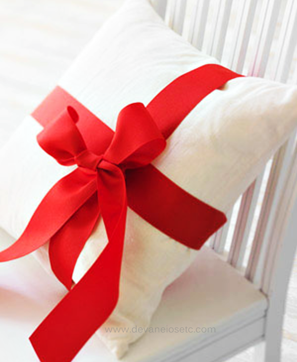 Como fazer: 1. Pegue uma almofada branca simples e faça um laço como se fosse um presente.