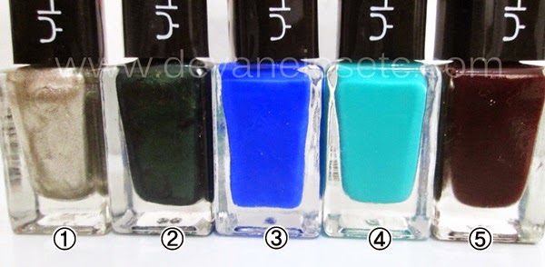Atenção: A numeração que coloquei de 1 a 5 é apenas para poder ficar mais fácil para visualizar a cor do frasco com a da unha, mas não corresponde a numeração do fabricante.